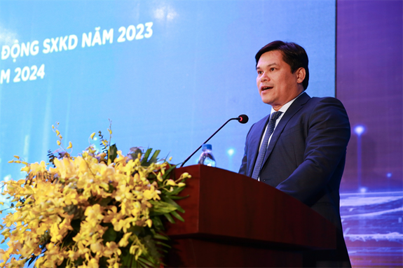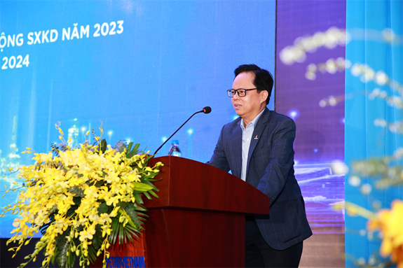 | Tổng giám đốc BSR Bùi Ngọc Dương báo cáo hoạt động sản xuất kinh doanh năm 2023 và triển khai kế hoạch năm 2024. |