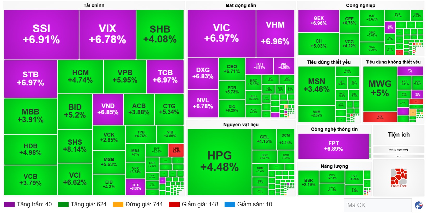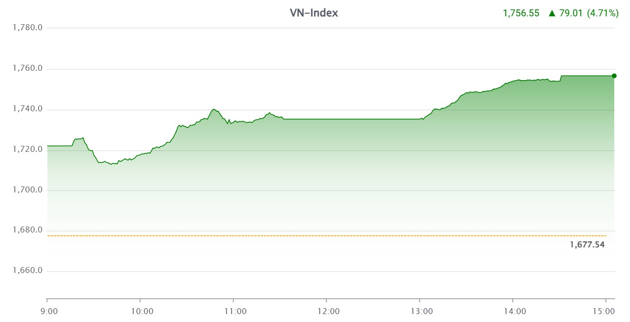 Theo đó, chỉ số VN-Index tăng hơn 79 điểm, tương ứng 4,71%. Trong đó nhóm vốn hóa lớn cũng dẫn dắt đà tăng chung thị trường. Chỉ số VN30-Index tăng hơn 90 điểm, tương ứng 4,89%. Có đến 7/30 mã cổ phiếu tăng trần gồm FPT, SSI, VHM, STB, TCB, VIC, VRE.