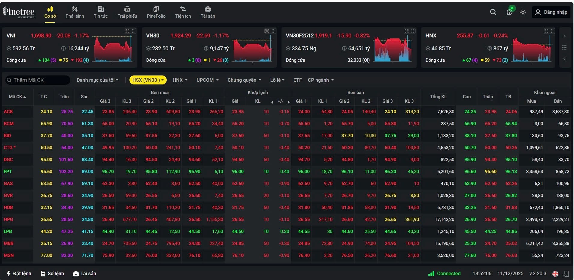 Thanh khoản toàn thị trường chỉ duy trì quanh mức 600–700 triệu cổ phiếu/phiên, cho thấy dòng tiền không thực sự dồi dào và chủ yếu tập trung vào một nhóm cổ phiếu mang tính cục bộ. Điều này khiến VN-Index tăng điểm nhưng thiếu tính lan tỏa sang các nhóm ngành còn lại.