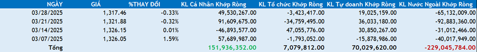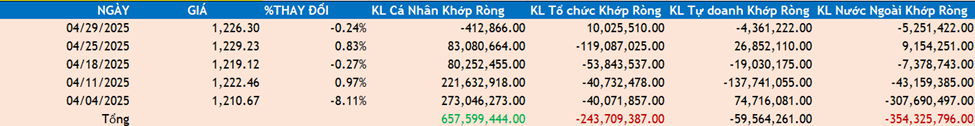• Nếu xem NĐT cá nhân là tay chơi chính ở nhịp tăng vừa qua thì với thống kê bán ròng cho thấy nhóm này đang bán ra lượng hàng đã nhập trong tháng 03,04/2025.