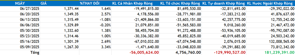 Để nắm được động thái của các nhóm, chúng tôi phân tích Khối lượng cổ phiếu giao dịch ròng của mỗi nhóm ở từng thời điểm đặc biệt: i). thời điểm VnIndex bắt đầu vượt 1,300pts ở tháng 3/2025 ; ii). thời điểm VnIndex giảm mạnh do thuế quan; iii). Thời điểm tăng giá trong tháng 5&6/25; iv). Thời điểm VnIndex về vùng giá cũ 1,530pts của 2022.
