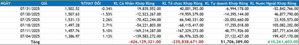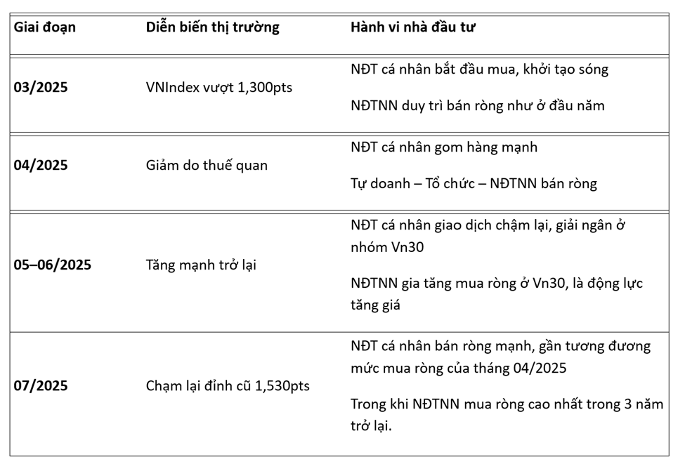• Trong tháng 07/2025, khi VnIndex tăng về vùng giá 1,500pts NĐT cá nhân giá tăng bán ròng – lượng bán ròng gần tương đương với lượng hàng mua vào ở tháng 4/2025
