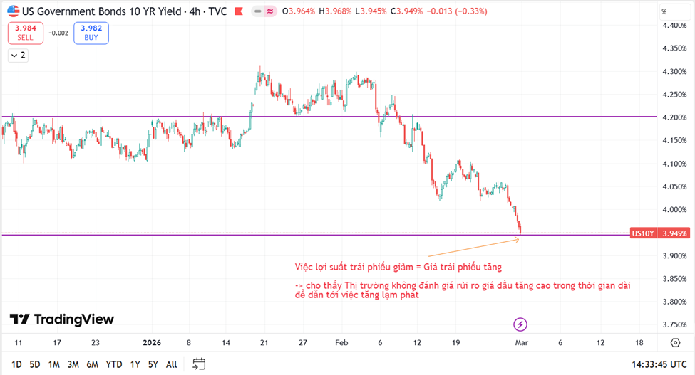 Đồng thời với việc giá trái phiếu US10Y đang tăng, cho thấy Thị trường không đánh giá rủi ro giá dầu tăng cao trong thời gian dài để dẫn tới việc tăng lạm phát
