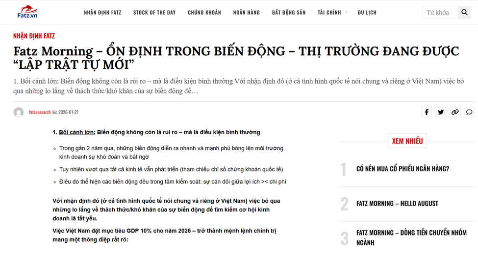 TTCK Việt Nam 2026 bước vào giai đoạn “thể chế hóa” – luật chơi thay đổi, dòng tiền tổ chức dẫn dắt: thị trường sẽ phân hóa mạnh, bluechip và doanh nghiệp có dòng tiền thật sẽ được ưu tiên như Nội dung bản tin trước Fatz Morning – ỔN ĐỊNH TRONG BIẾN ĐỘNG – THỊ TRƯỜNG ĐANG ĐƯỢC “LẬP TRẬT TỰ MỚI” – Fatz.vn