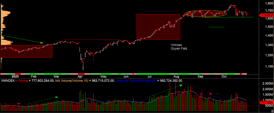 Và trong tuần cuối tháng 10/2025, VnIndex giao dịch quanh 1,650pts. Trong tuần qua lực cầu có phiên đánh lên vào thứ 3 nhưng sau đó thất bại (giá giảm 2 phiên sau đó), điều này cho thấy ưu thế của lực cung & Hỗ trợ 1,605pts sẽ được thử thách trong tuần này.