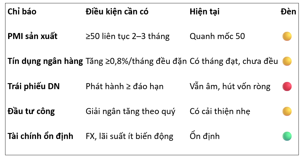 👉 Tổng quan: 3 vàng – 1 đỏ – 1 xanh. Kinh tế đang ấm dần, nhưng chưa có “chuỗi tín hiệu mạnh” để thị trường bùng nổ tiếp.