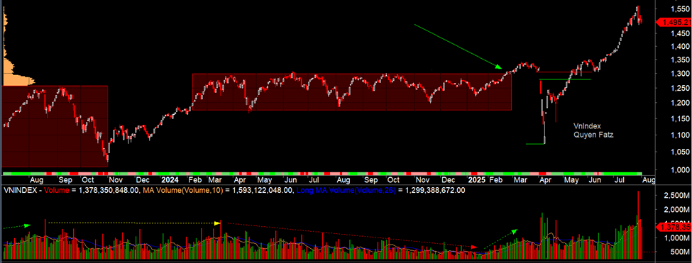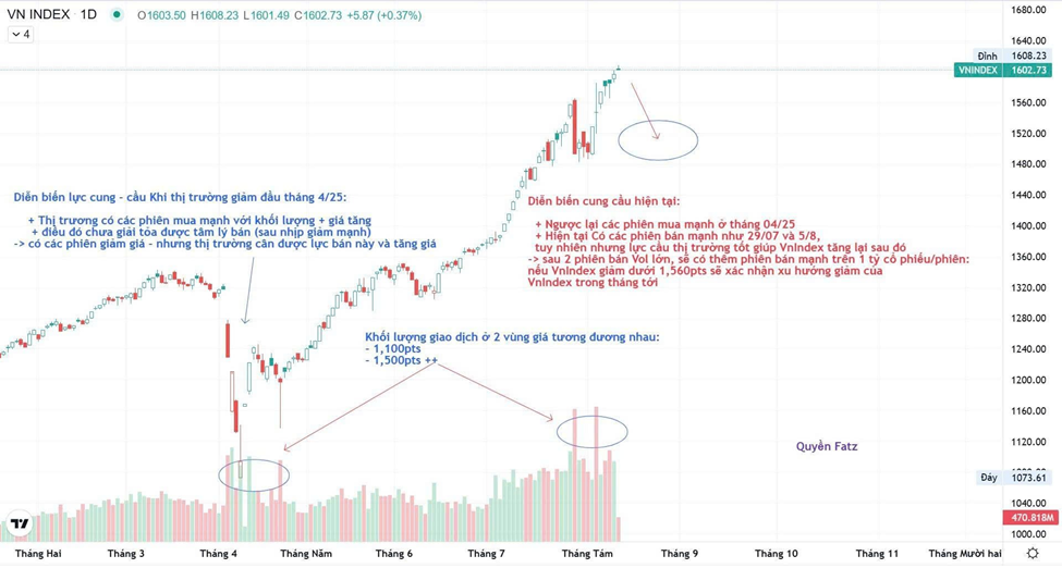 Giai đoạn 2: Ở nhịp giao dịch của tháng 08/2025, VnIndex đã có 2 phiên bán chủ động mạnh (ngày 29/07 và 05/08) với khối lượng kỷ lục là hơn 2.5 tỷ cổ phiếu/phiên. Sau đó giá tăng lại khi lực cầu mạnh chặn đà bán. Điều này khiến VnIndex tạo diễn biến giao dịch ngược lại so với tháng 04/2025: tăng mạnh trước đó -> giảm do lực bán chủ động -> lực cung chặn đà giảm, đẩy giá tăng -> … theo đó thì sẽ có phiên bán chủ động lần 3 với khối lượng trên 2 tỷ cổ phiếu/phiên.