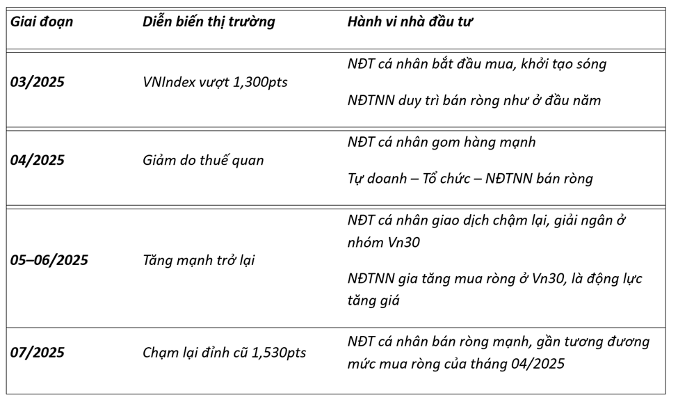 Để nắm được động thái của các nhóm, chúng tôi phân tích Khối lượng cổ phiếu giao dịch ròng của mỗi nhóm ở từng thời điểm đặc biệt: i). thời điểm VnIndex bắt đầu vượt 1,300pts ở tháng 3/2025 ; ii). thời điểm VnIndex giảm mạnh do thuế quan; iii). Thời điểm tăng giá trong tháng 5&6/25; iv). Thời điểm VnIndex về vùng giá cũ 1,530pts của 2022.