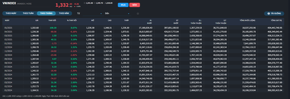 Trong tháng 05/2025, VnIndex tăng 8.67% – là mức tăng cao nhất/tháng từ đầu năm 2024 tới nay. Và là mức tăng cao thứ nhì nếu tính từ tháng 01/2023 (vào tháng 01/2023 thị trường tăng 10.34% sau nhịp giảm -20% trước đó vào cuối 2022).