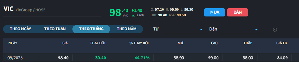 Đóng góp vào mức tăng 8.67% của VnIndex trong tháng 05/2025 là nhóm: bất động sản VIC +45%, VHM + 33%, VRE + 15%, GVR NVL +20%, PNJ TCB + 15%, GAS POW VPB +10%