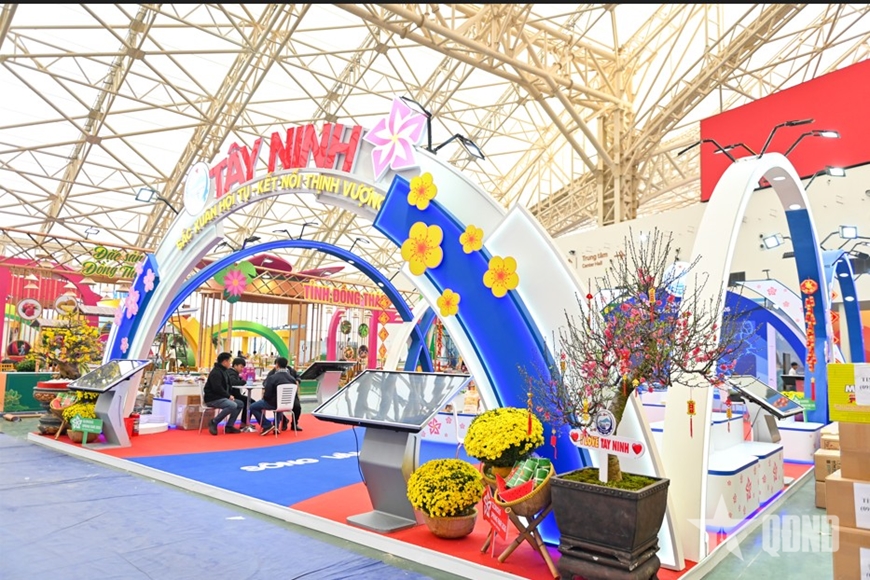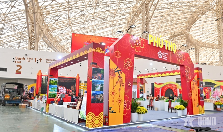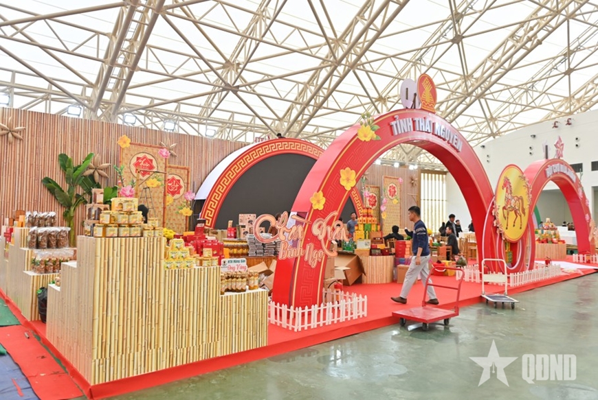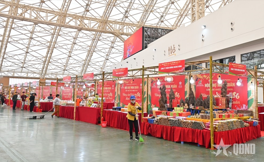 Tại khu vực trung tâm, nơi diễn ra các hoạt động trưng bày, quảng bá và kết nối giao thương, hệ thống khung gian hàng đã được hoàn thành. Các hạng mục trang trí, điện chiếu sáng, âm thanh, sân khấu chính, khu vực check-in đã hoàn thiện theo đúng thiết kế. Không gian hội chợ đang hiện rõ với sắc xuân chủ đạo, tạo diện mạo sinh động, sẵn sàng đón khách tham quan.