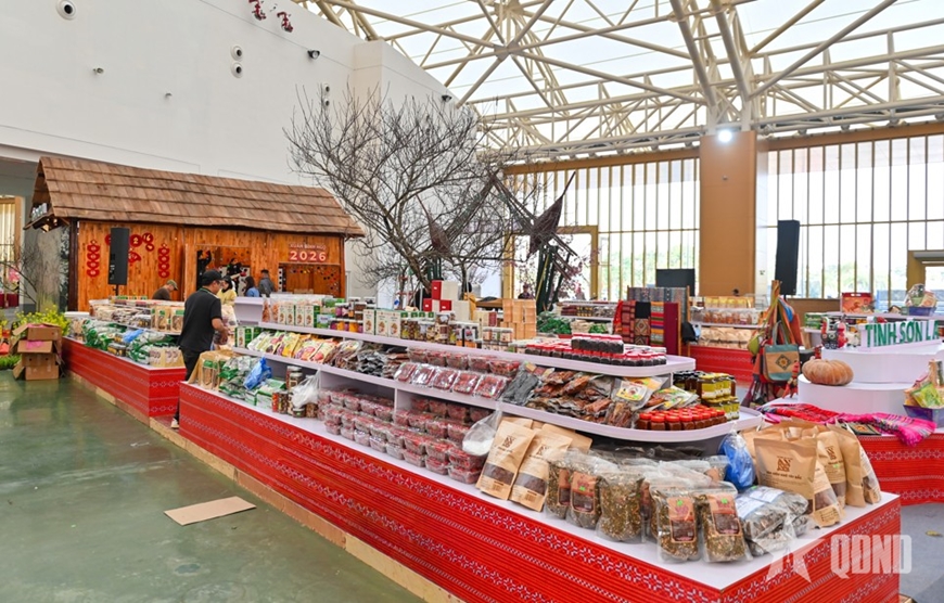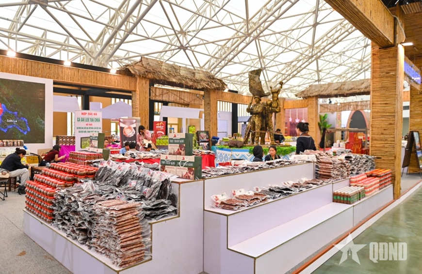 | Tại khu vực trưng bày sản phẩm OCOP, đặc sản vùng miền và nông sản chủ lực, các gian hàng đã định hình rõ nét. |