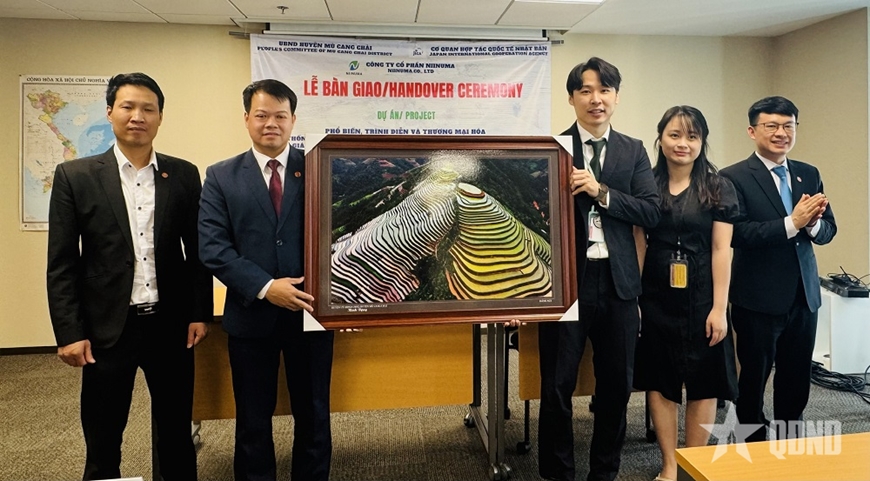 | Đại diện huyện Mù Cang Chải tặng bức tranh ruộng bậc thang Mù Cang Chải tới đại diện JICA. |