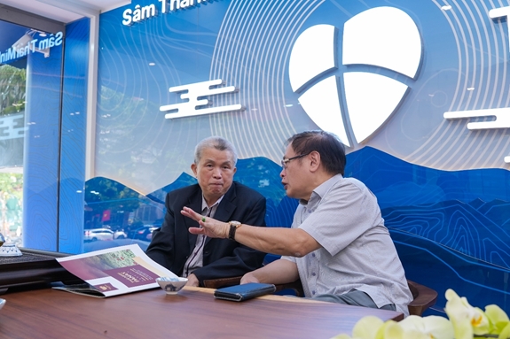 | Dược sĩ Nguyễn Quang Thái (bên phải) giới thiệu về Sâm Dược Thái Minh tới Thứ trưởng Thường trực Bộ Y tế Đỗ Xuân Tuyên. |