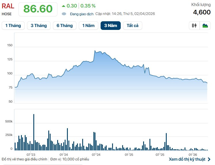 Trên thị trường, cổ phiếu RAL hiện đang “dò đáy” 3 năm quanh vùng 86.600 đồng/cp, tương đương giảm khoảng 7% so với đầu năm. Vốn hóa thị trường đạt hơn 2.000 tỷ đồng.