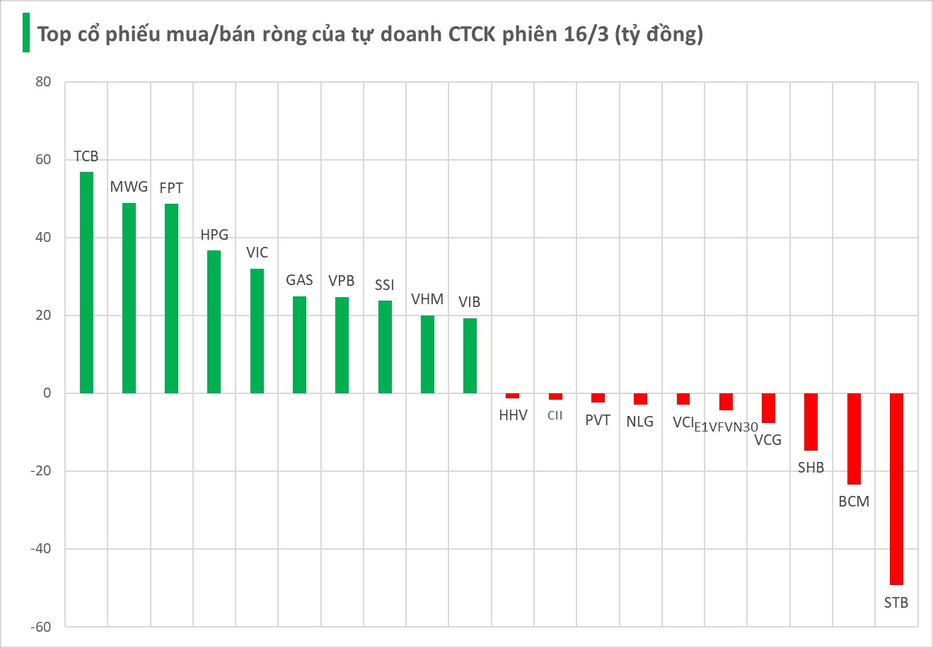 Cụ thể, TCB và MWG được mua ròng với giá trị lần lượt là 57 tỷ và 49 tỷ đồng. Theo sau là FPT (49 tỷ), HPG (37 tỷ), VIC (32 tỷ), GAS (25 tỷ), VPB (25 tỷ), SSI (24 tỷ), VHM (20 tỷ) và VIB (19 tỷ đồng) đều được tự doanh CTCK mua mạnh.