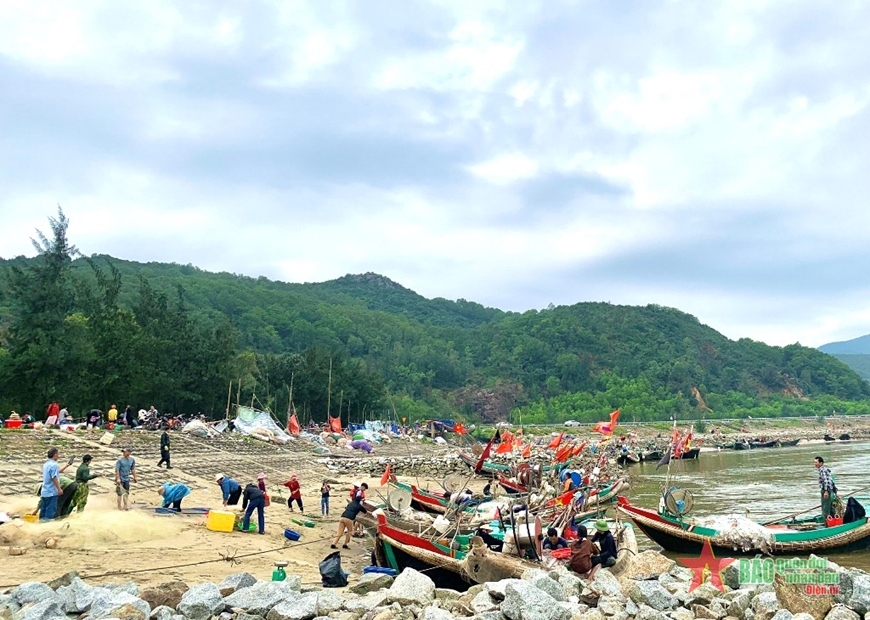 Tại xã Thịnh Lộc, Lộc Hà (Hà Tĩnh), dọc tuyến đê biển, các tàu, thuyền tấp nập cập bờ, chở các loại hải sản còn tươi rói lên bờ. Các gia đình huy động lực lượng khẩn trương gỡ cá khỏi lưới, bán ngay bên bờ biển cho người dân.
