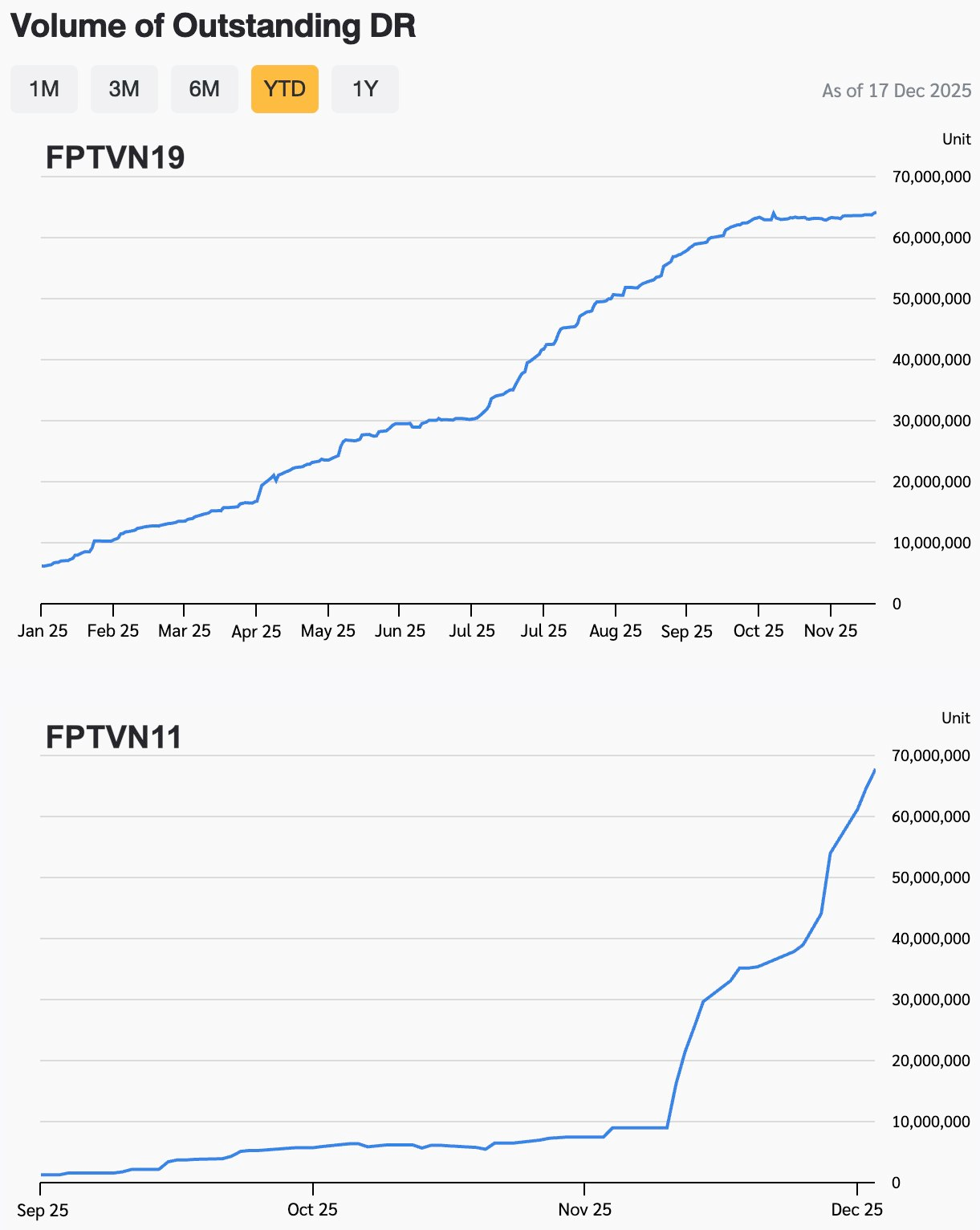 Theo Sở Giao dịch Chứng khoán Thái Lan (SET), tính đến ngày 17/12/2025, lượng chứng chỉ lưu ký DR FPT (mã FPTVN19) dựa trên cổ phiếu FPT do Chứng khoán Yuanta phát hành đã thiết lập mức kỷ lục mới, đạt gần 64,3 triệu đơn vị. So với đầu năm, quy mô DR này đã tăng thêm khoảng 58 triệu đơn vị. Với tỷ lệ chuyển đổi 1:19, nhà đầu tư Thái Lan hiện đang gián tiếp sở hữu hơn 3,3 triệu cổ phiếu FPT thông qua sản phẩm này.