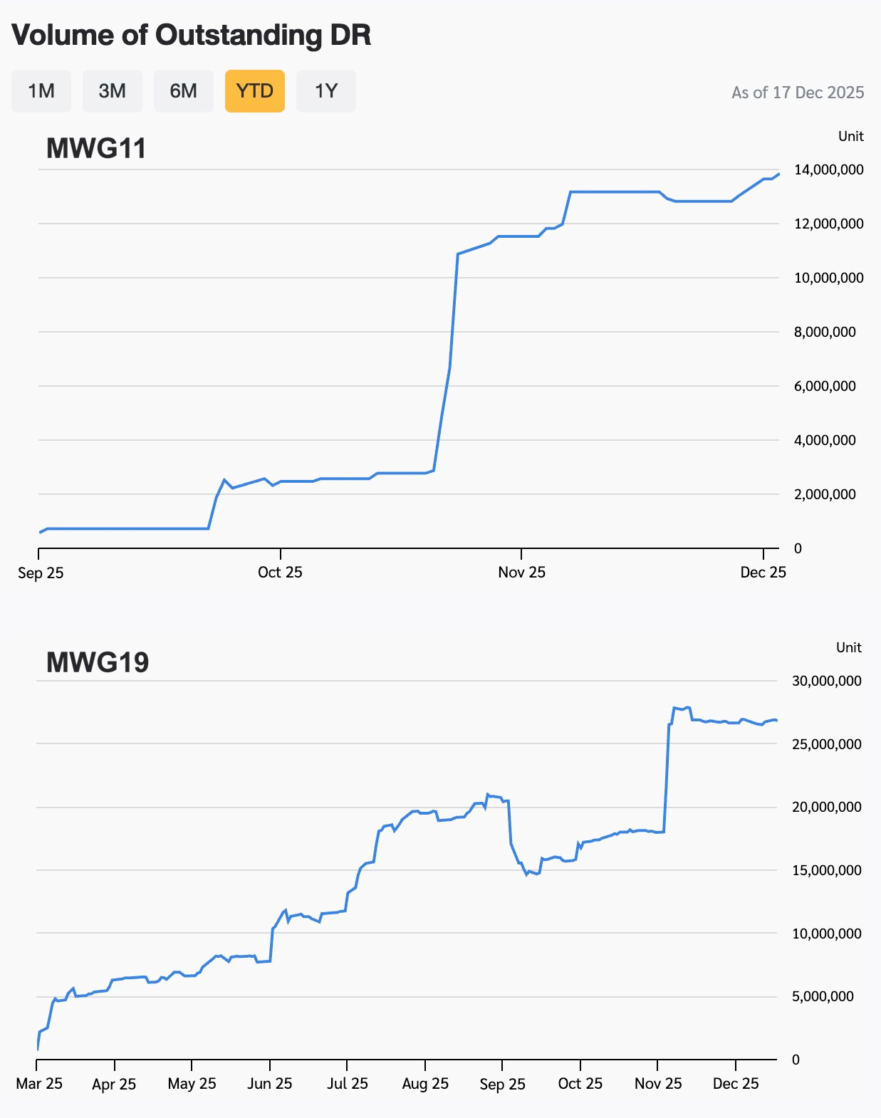 Tính đến ngày 17/12/2025, lượng DR MWG19 đã xấp xỉ 27 triệu đơn vị, tương ứng giá trị vốn hóa khoảng 268 triệu baht. Với tỷ lệ chuyển đổi 1:19, nhà đầu tư Thái Lan đang gián tiếp nắm giữ hơn 1,4 triệu cổ phiếu MWG. Trong khi đó, DR MWG11 ghi nhận gần 14 triệu đơn vị đang lưu hành, với vốn hóa khoảng 55 triệu baht. Tỷ lệ chuyển đổi 1:11 cho thấy nhà đầu tư xứ Chùa Vàng đang gián tiếp sở hữu gần 1,3 triệu cổ phiếu MWG thông qua sản phẩm này.