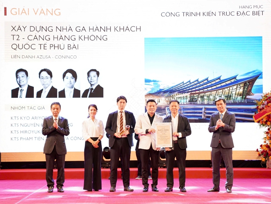 Ông Lê Văn Khiên, Thành viên Hội đồng quản trị Tổng công ty Cảng hàng không Việt Nam (ACV), đại diện chủ đầu tư cùng nhóm thiết kế là các kiến trúc sư Kyo Ariyoshi, Nguyễn Đăng Quang, Hiroyuki Enomoto, Phạm Tiến Thắng và cộng sự đã vinh dự đón nhận các giải thưởng.