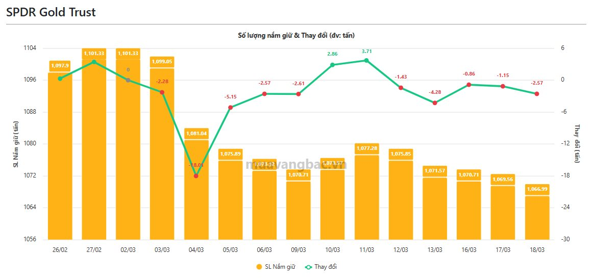Theo dữ liệu từ Muavangbac.vn, quỹ vàng lớn nhất thế giới SPDR Gold Trust tiếp tục bán ròng 2,57 tấn vàng trong ngày 18/3, kéo lượng nắm giữ xuống dưới 1.061 tấn. Đây là phiên bán ròng thứ 5 liên tiếp của quỹ này, với tổng khối lượng xả lên tới 10,3 tấn vàng.