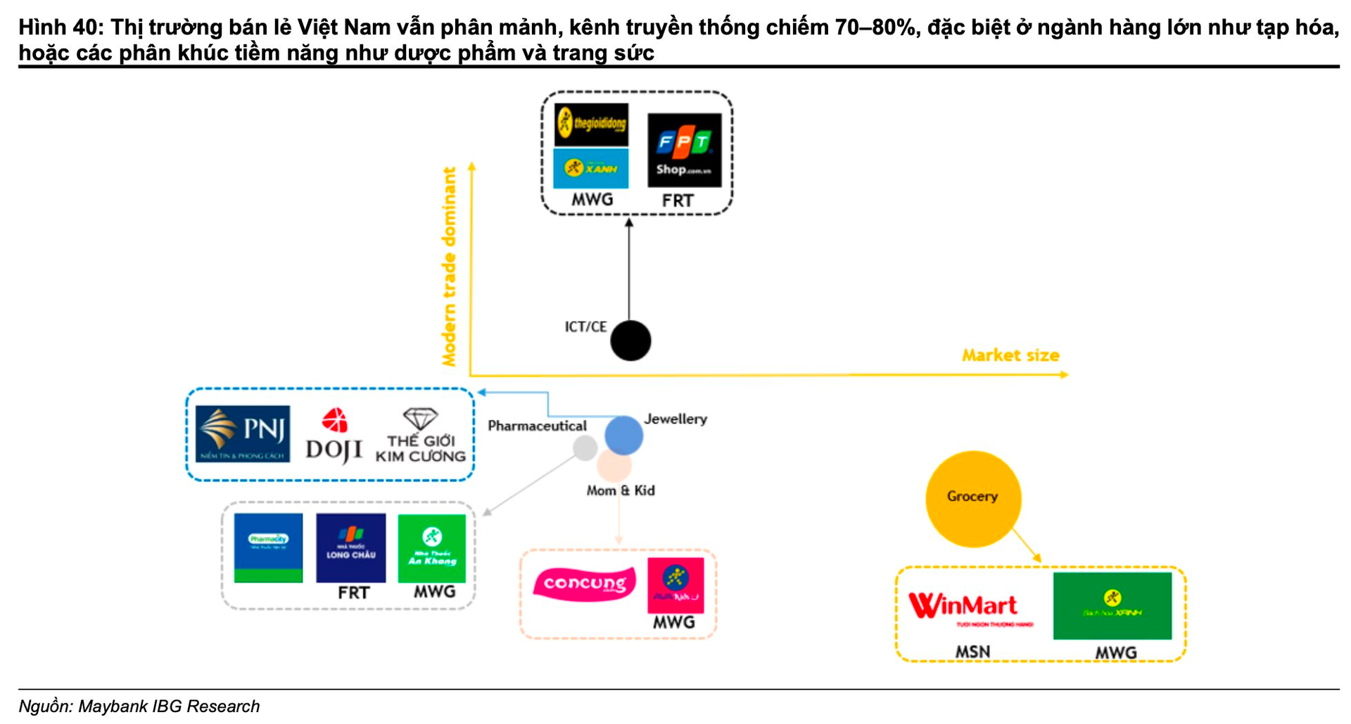 Dù xu hướng chuyển dịch sang bán lẻ hiện đại đang diễn ra, thị trường bán lẻ Việt Nam vẫn còn phân mảnh. Ngoại trừ ngành công nghệ thông tin/điện tử tiêu dùng, các phân khúc còn lại vẫn có mức độ thâm nhập của bán lẻ hiện đại thấp. Điều này cho thấy tiềm năng tăng trưởng lớn cho các doanh nghiệp dẫn đầu đang thúc đẩy quá trình chuyển đổi sang bán lẻ hiện đại, đặc biệt trong tạp hóa, dược phẩm và trang sức.