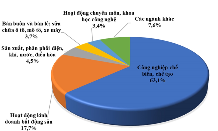 Theo ngành: các nhà ĐTNN đã đầu tư vào 19/21 ngành trong hệ thống phân ngành kinh tế quốc dân. Trong đó, ngành công nghiệp chế biến, chế tạo chiếm tỷ trọng cao nhất với hơn 298,7tỷ USD (chiếm 60,7% tổng vốn đầu tư). Tiếp theo là các ngành kinh doanh bất động sản với hơn 71,5 tỷ USD (chiếm 14,5% tổng vốn đầu tư); sản xuất, phân phối điện với gần 41,7 tỷ USD (chiếm 8,5% tổng vốn đầu tư).