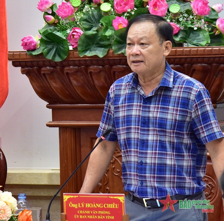 Đồng chí Lý Hoàng Chiêu, Chánh văn phòng UBND tỉnh Tiền Giang phát biểu tại buổi họp báo.