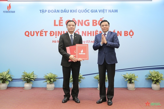 Đồng chí Lê Mạnh Hùng, Bí thư Đảng ủy, Chủ tịch Hội đồng thành viên Petrovietnam trao quyết định bổ nhiệm Tổng giám đốc cho đồng chí Lê Ngọc Sơn. |
