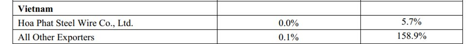 Đối với Việt Nam, CBSA công bố biên độ bán phá giá cho Công ty TNHH Thép dây Hòa Phát ở mức 5,7%, thấp nhất trong các DN bị điều tra và giảm hơn một nửa so với biên độ điều tra sơ bộ 13,4%. Các nhà xuất khẩu khác của Việt Nam bị xác định biên độ bán phá giá ở mức 158,9%.