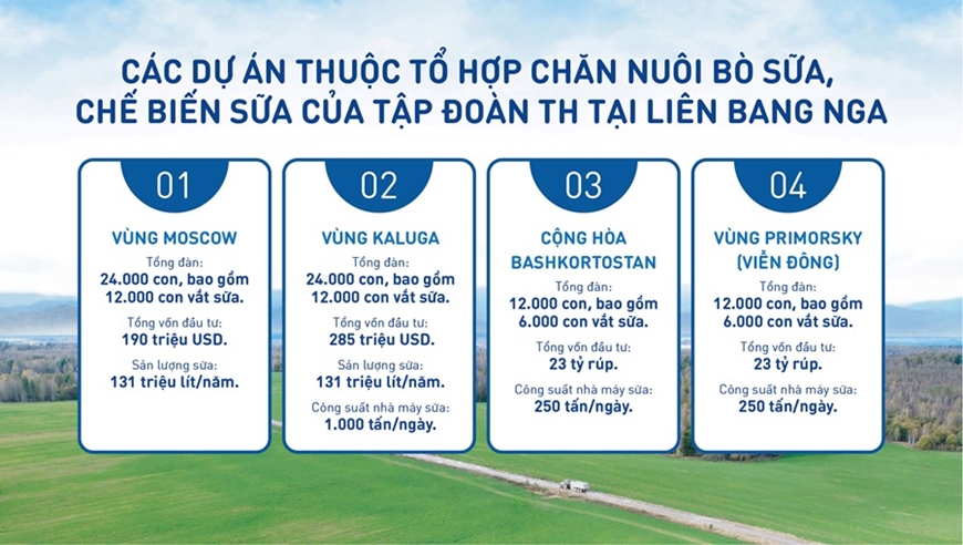 Cùng với đó, tại Cộng hòa Bashkortostan, TH phát triển dự án nông nghiệp công nghệ cao kết hợp trồng cây dược liệu và chế biến thực phẩm hữu cơ, hướng tới xuất khẩu; và tại vùng Viễn Đông Primorsky, triển khai trang trại bò sữa quy mô 6.000 con, vốn đầu tư hơn 200 triệu USD, hướng đến cung cấp sữa cho khu vực châu Á-Thái Bình Dương.