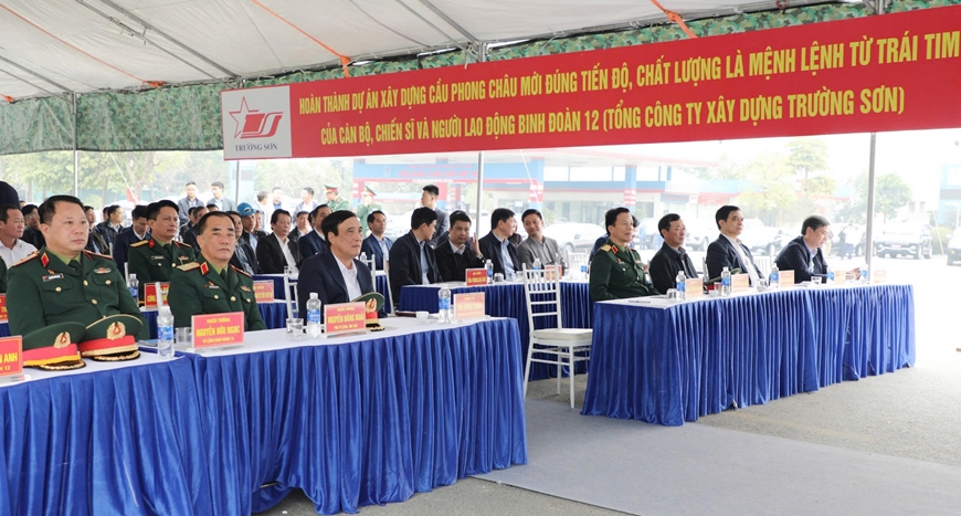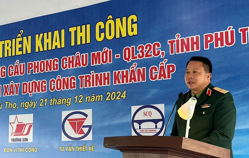 Phát biểu tại buổi lễ, Thiếu tướng Nguyễn Hữu Ngọc, Tư lệnh Binh đoàn 12 chia sẻ, Binh đoàn 12 rất vinh dự, tự hào được Bộ Giao thông vận tải, Ban Quản lý dự án Thăng Long và Bộ Quốc phòng tin tưởng giao nhiệm vụ thi công Dự án xây dựng cầu Phong Châu mới.